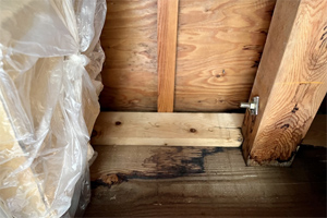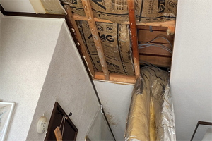 今の住宅には厚い断熱材があるため、雨が侵入してもまずは断熱材が水を吸い込みます。天井にシミとして現れるのは、断熱材がもう水を吸いきれなくなった「最終段階」です。
